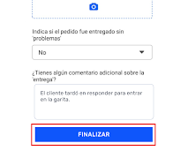 Al entregar el pedido carga las evidencias y asegúrate de marcar FINALIZAR. Así el cliente recibe una notificación con la confirmación de entrega del pedido.